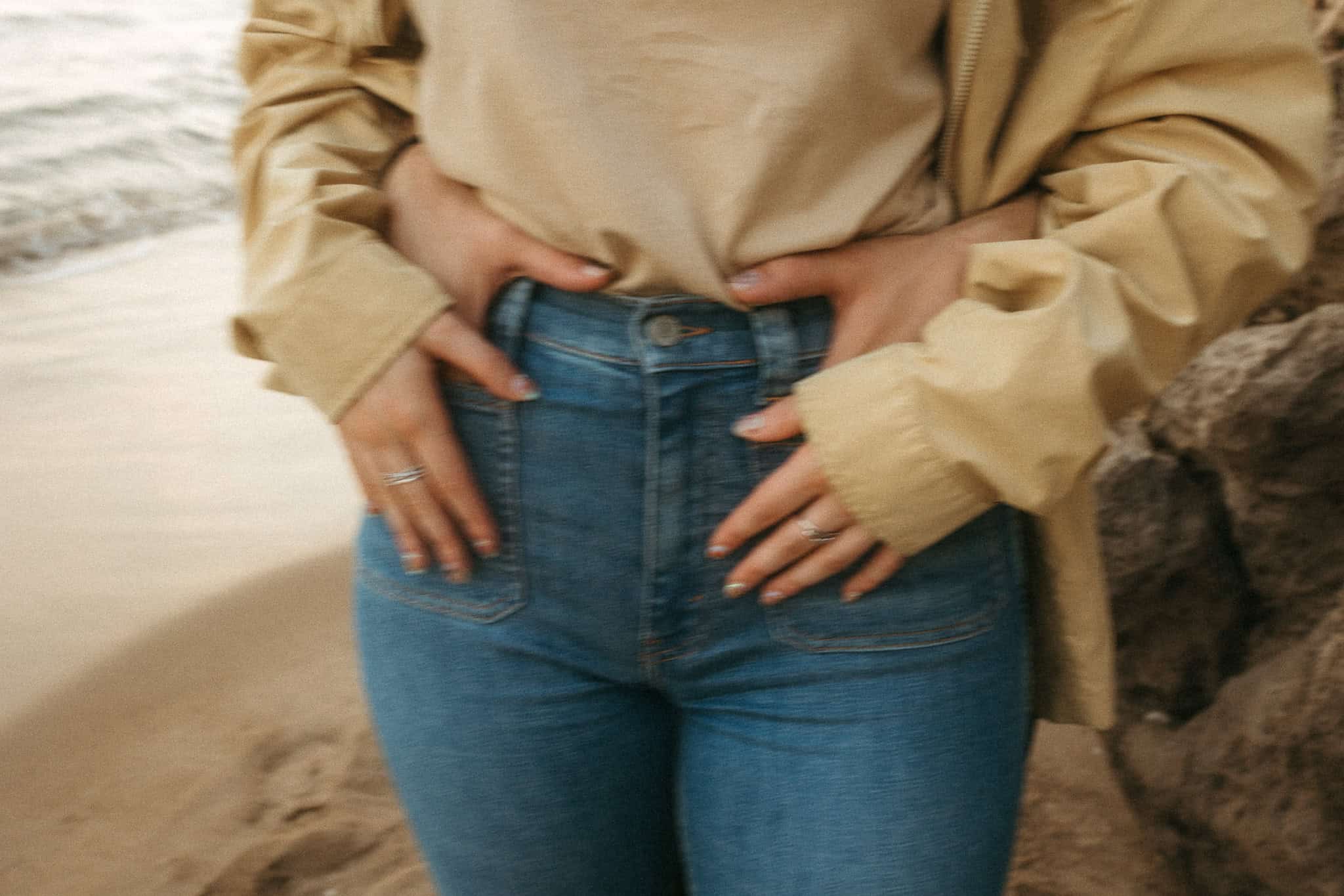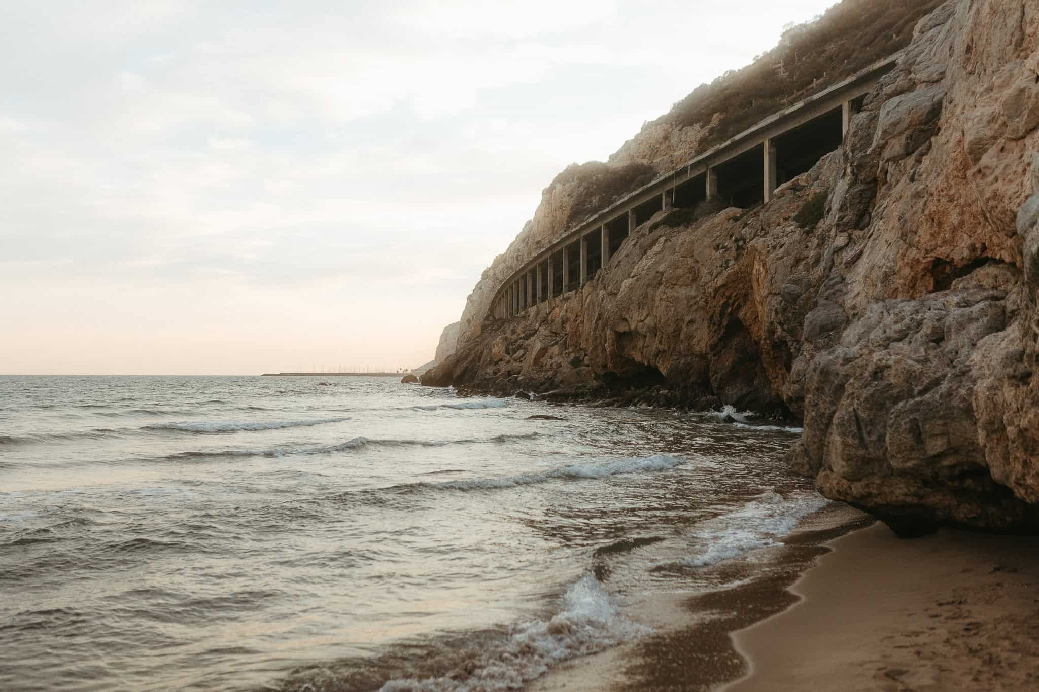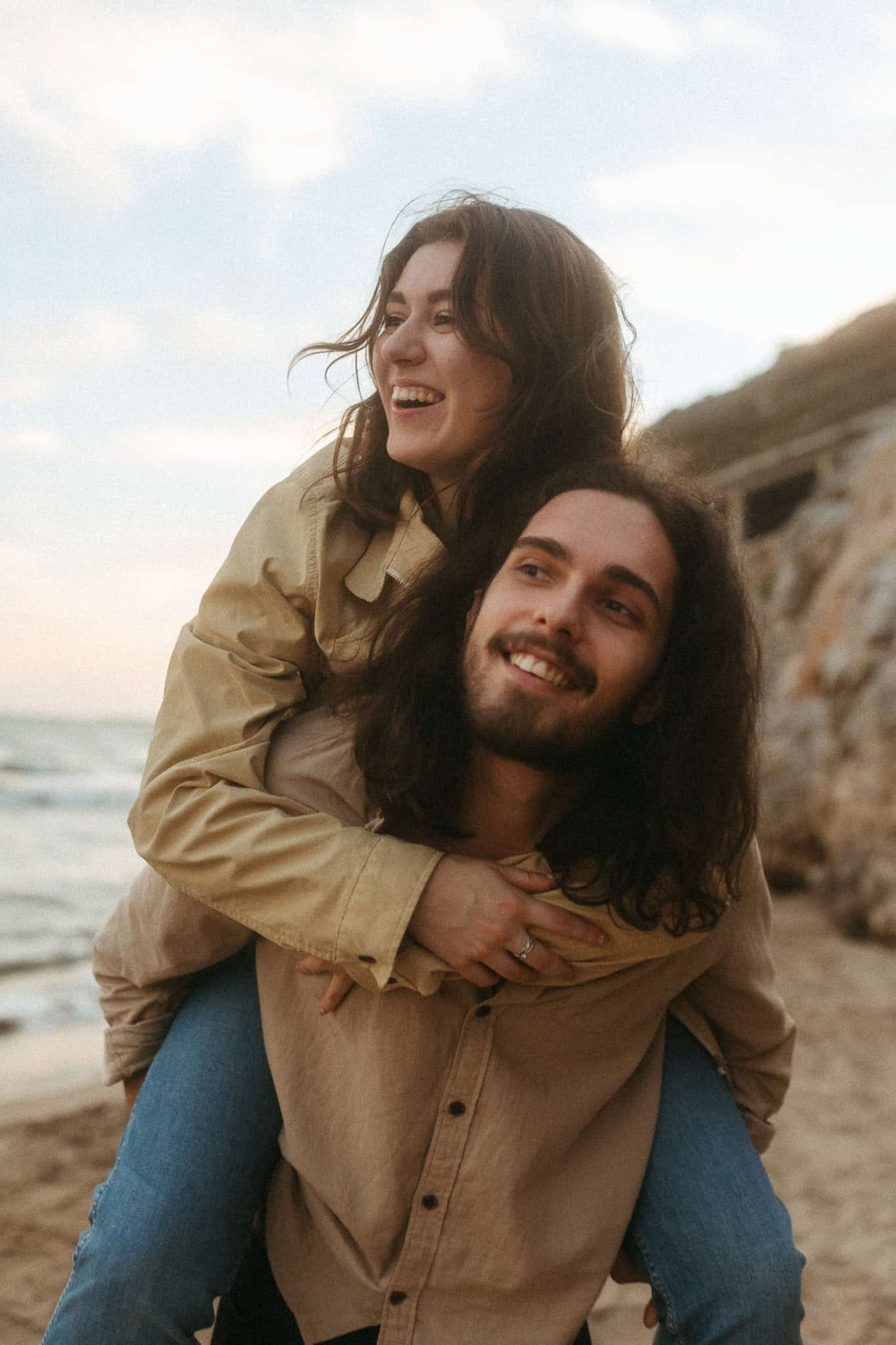 This creative couple photoshoot took place on a quiet beach just outside Barcelona. Designed as a relaxed and movement-driven session, the evening unfolded naturally – running along the shoreline, climbing the rocks, and pausing as he played his guitar by the sea.